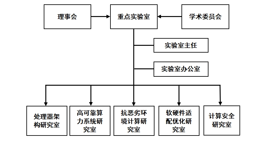 實驗室實行理事會領(lǐng)導(dǎo)下的實驗室主任負責制,成立學(xué)術(shù)委員會,設(shè)立實驗室辦公室。根據(jù)發(fā)展目標和重點任務(wù),設(shè)置處理器架構(gòu)、高可靠算力系統(tǒng)、抗惡劣環(huán)境計算、軟硬件適配優(yōu)化、計算安全五個研究室。
